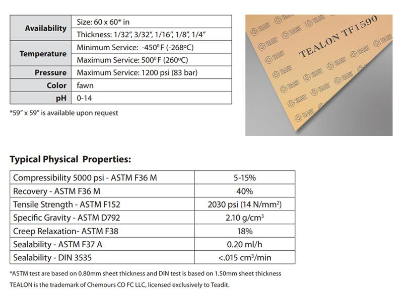 TEALON TF1590 is filled with silica to meet a variety of applications. It is suitable for general working conditions, strong acids and moderately corrosive solutions. It meets FDA service requirements for food and pharmaceutical applications. The TF1590 easily passed the heat compression test with excellent results.