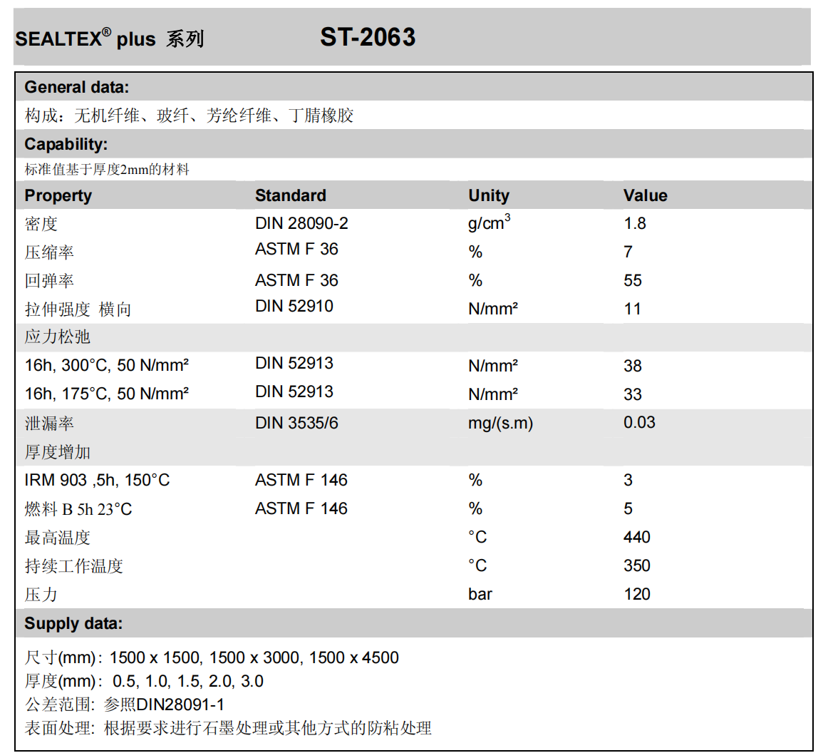 In order to meet the market demand, we have launched the non-asbestos sheet ST-2063 for high temperature steam, which has excellent heat resistance and mechanical properties due to the content of glass fibers and inorganic fillers. It complies with the following certifications: