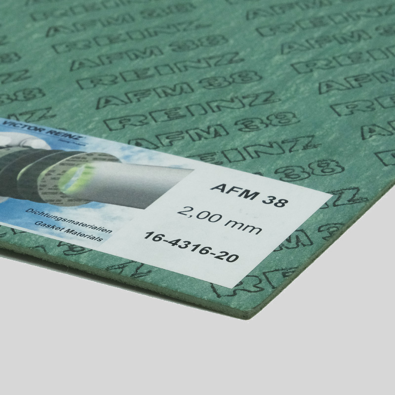 AFM 38 is an asbestos- free gasket material. It consists of aramide fibers and other asbestos substitutes that are resistant to high temperatures and are processed with high- grade elastomers under elevated pressure and temperature.