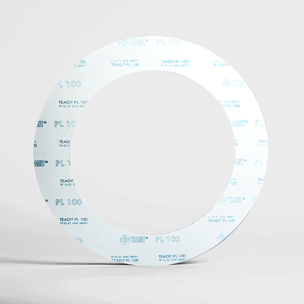 TEADIT® PL 100 is a highly compressible sheet, manufactured with PTFE through a unique lamination process, with a high level of fibrillation, which provides reduced loss of tightness and fluidity, inherent deficiencies of the existing machined (rigid) sheets in the market, being also used in contact with food and pharmaceutical products. It has excellent dimensional stability, torque retention and the best cost-benefit ratio among similar materials. Due to the chemical properties of PTFE, TEADIT® PL 100 is suitable for sealing a wide variety of chemically aggressive fluids. The manufacturing process of TEADIT® PL 100 produces a rigid, low density sheet, which facilitates the manufacture of light and structured gaskets, allowing its installation even in places of difficult access and with little space for the opening of the flanges. Its high compressibility also enables TEADIT® PL 100 gaskets to be used on flanges or irregular surfaces. Their non-stick properties make it easy to remove the gaskets after use, even without leaving any material residue on the flanges.