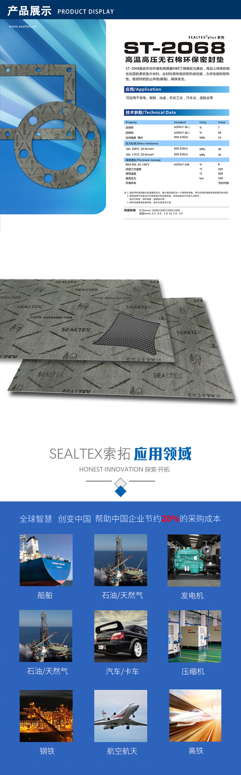 ST-2068是由高模量丁腈橡胶NBR和精选芳纶纤维加工而成的无石棉环保密封垫片材料,并填加了金属丝增强。故其具有极好的耐高温和物理机械性能,并有良好的抗吹出性。
