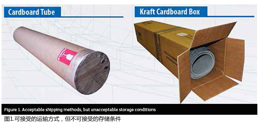 请注意,特别是对于弹性体粘合纤维片材,尽管盒子和纸管是经批准的以卷材形式运输片材的方法,但它们不应在任何情况下用作长期存放(参见图1)。