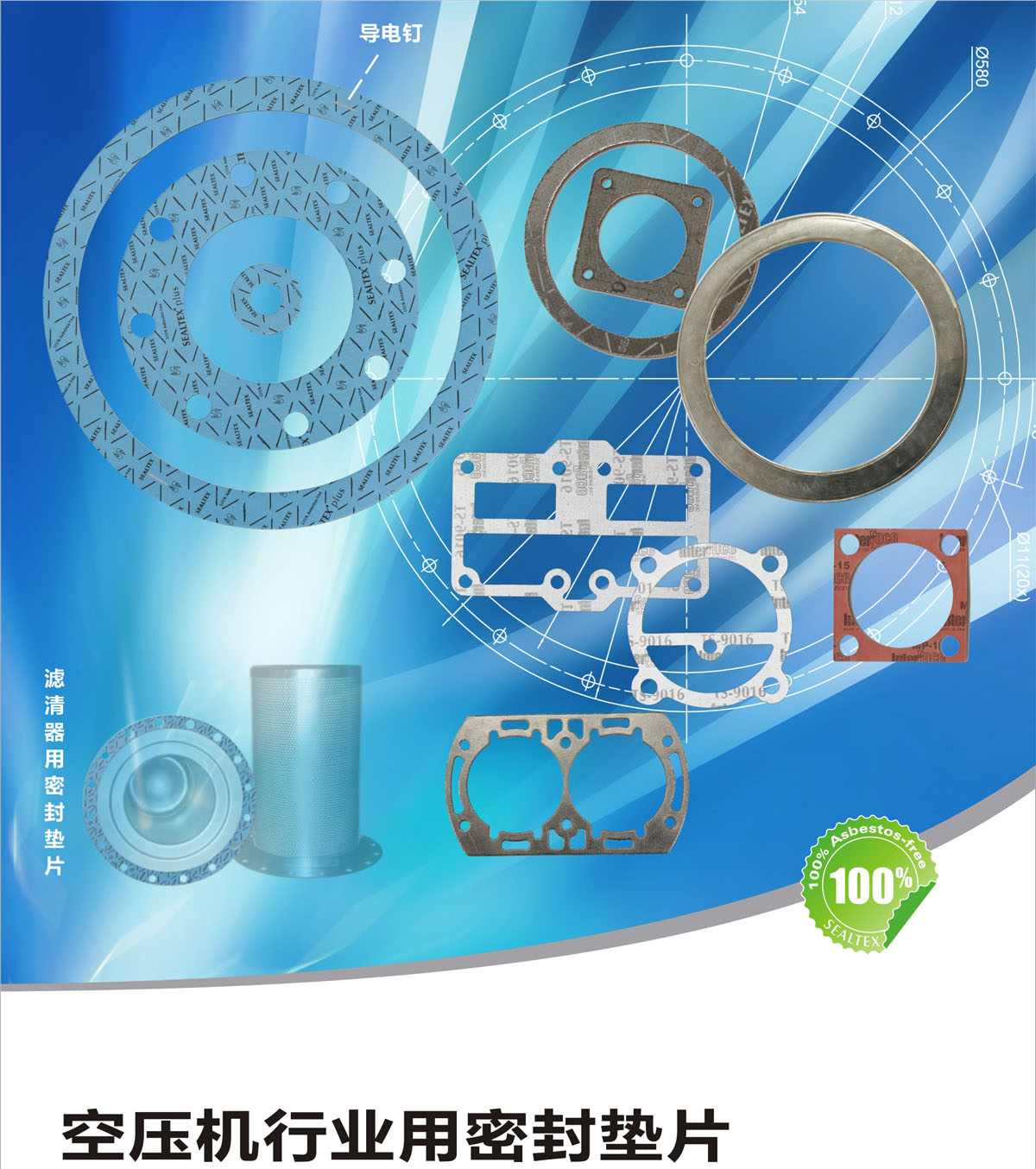 可应用于活塞机、螺杆机等各类压缩机中的空气滤清器、机头、阀板、曲轴箱、轴承盖、进排气口、油漆桶、油路等部分的密封。