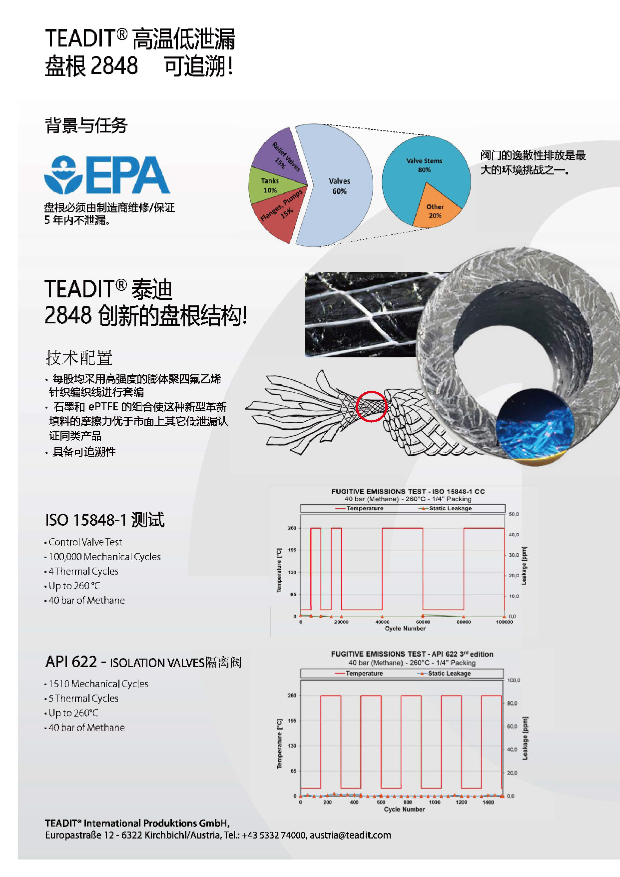 TEADIT® 2848盘根 是一种专为控制阀和隔离阀设计的低泄漏盘根填料。对于控制阀,它在ISO 15848-1泄漏的测试流程 CC3 中证明了其性能。即使在经过100,000 次机械循环和4次热循环后,该盘根的泄漏量仍小于 2 ppm。至于隔离阀,它已成功通过 API622第3版的测试,即使在经过 1510次机械循环和 5次热循环后,泄漏量仍低于2 ppm。