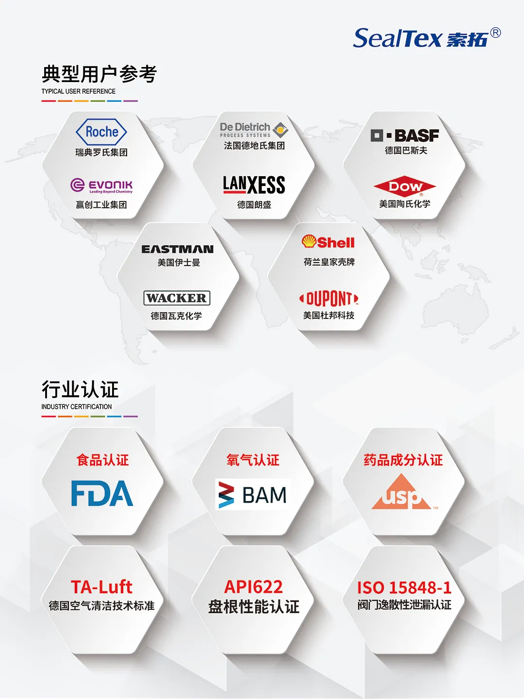 我司代理合作品牌TEADIT泰迪已为全球多家知名化工企业提供密封解决方案服务,例如:BASF巴斯夫、Shell壳牌、Roche罗氏等。且产品可满足FDA、BAM、DVGW、ups、TA-Luft、API622、ISO 15848-1等不同标准要求。还在耐高温、耐腐蚀等性能上表现出色,能够满足天然气、石油、化工等严苛工况下的密封需求