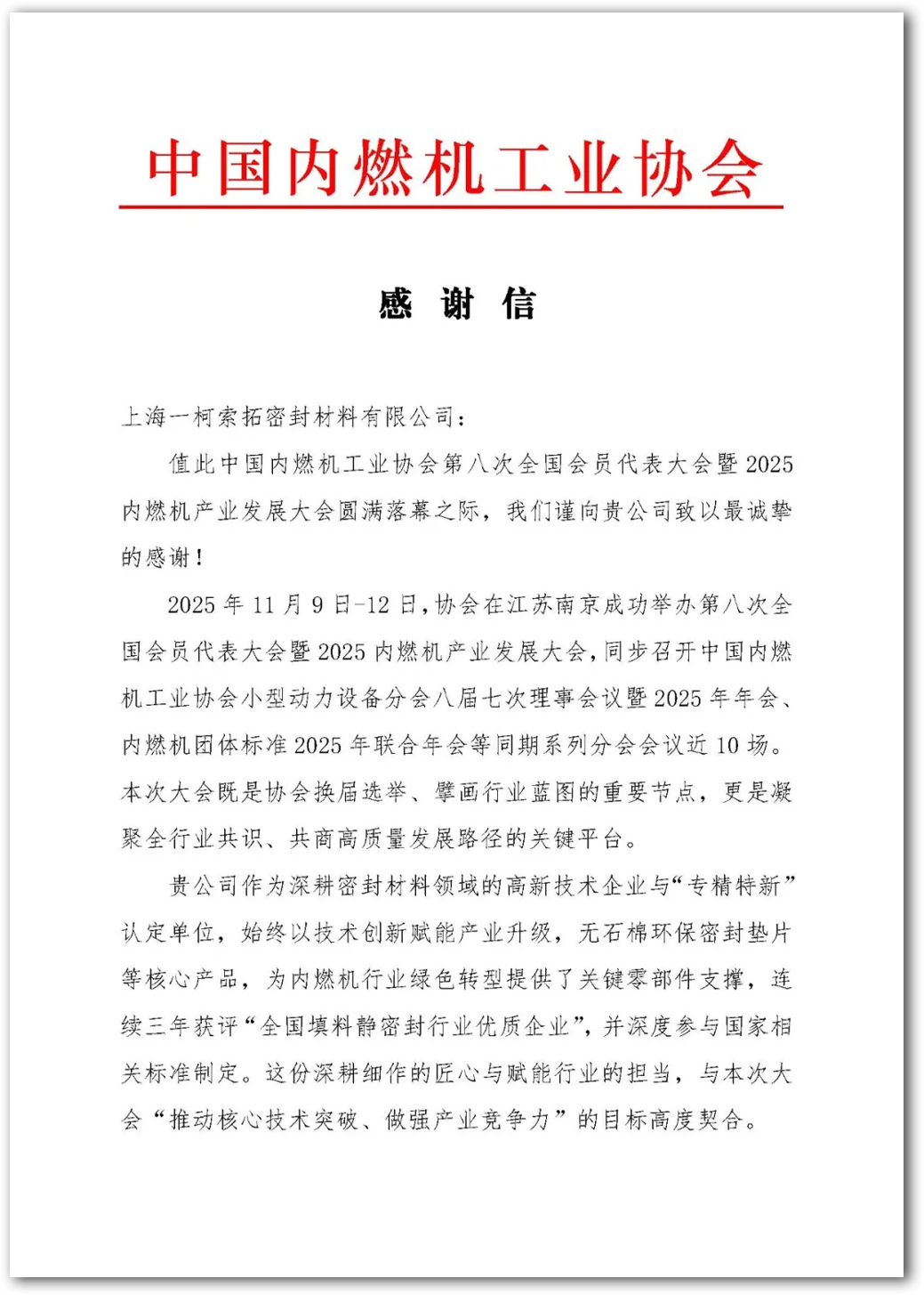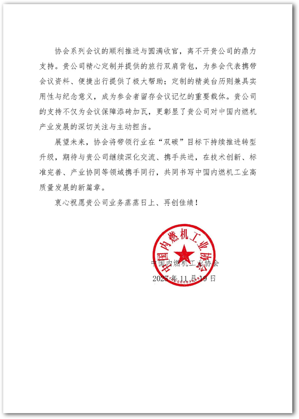 来自中国内燃机工业协会的感谢信 近日,我司收到来自中国内燃机工业协会的感谢信,也借此机会感谢协会的多年信任和支持,作为会员我们一直全力尽责尽职并很荣幸作为其中一员推动协会和行业的发展。并再次祝贺大会的成功召开。 上一个 返回列表 下一个